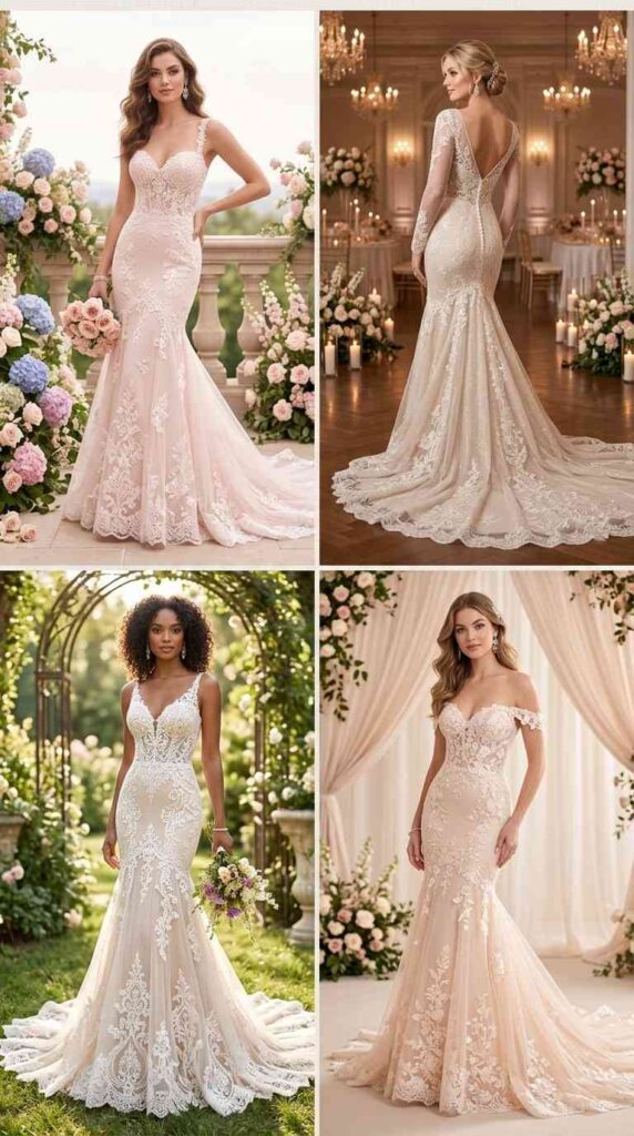 A mermaid wedding dress is designed to fit closely to the body from the chest down to the knees, then flare out dramatically toward the hem. This creates a “mermaid tail” effect, which is where the style gets its name. When paired with lace fabric—often featuring floral, vintage, or modern patterns—the dress becomes even more romantic and detailed.