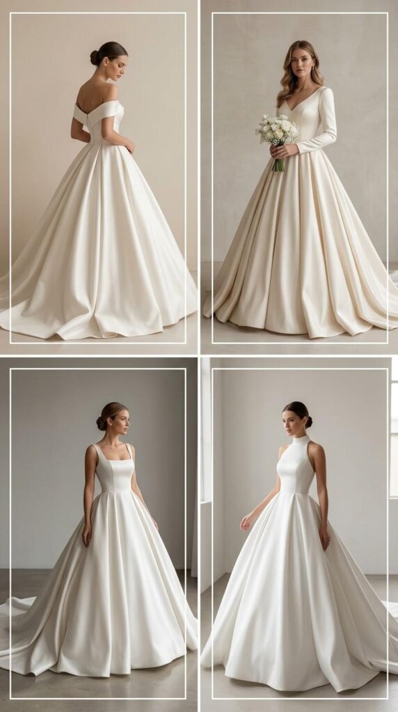 • Luxury Fabrics: Satin, tulle, lace, and organza remain common choices.